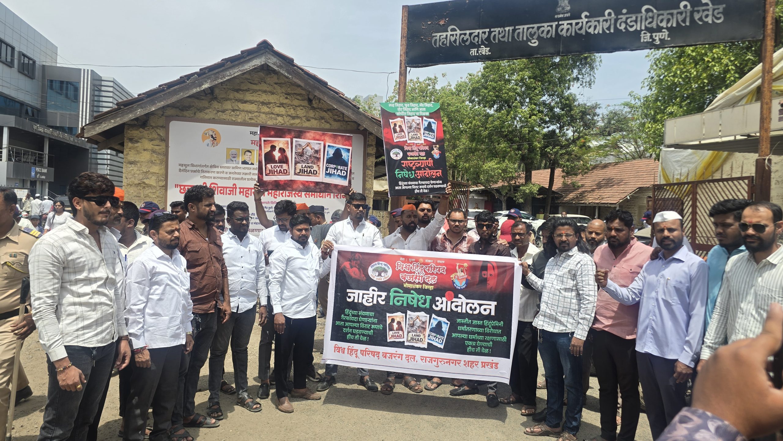 राजगुरुनगर, १७ एप्रिल : नाशिक शहरात घडलेल्या कॉर्पोरेट जिहाद, धर्मांतर व लव जिहाद प्रकरणांच्या पार्श्वभूमीवर विश्व हिंदू परिषद (व्हीएचपी) व बजरंग दलाच्या नाशिक विभागाने तीव्र स्वरूपाची आंदोलने जाहीर केली आहेत. या मोहिमेचा पहिला टप्पा आज शुक्रवारी राजगुरुनगर तहसील कार्यालयासमोर घेतला जात असून, मोठ्या संख्येने कार्यकर्त्यांनी उपस्थिती लावली. या वेळी तहसीलदार प्रशांत बेडसे यांना निवेदन सादर करण्यात आले.नाशिक शहरात अलीकडे उघडकीस आलेल्या घटनांमुळे हिंदू समाजात प्रचंड रोष पसरला आहे. विशेषतः TCS नाशिक कार्यालयात घडलेल्या कथित धर्मांतर व छळप्रकरणाने वातावरण तापले आहे. यात सात जणांना अटक झाली असून, नऊ गुन्हे दाखल झाले आहेत. आरोपींनी हिंदू कर्मचाऱ्यांना धमक्या, ब्लॅकमेल, अस्पृश्य वर्तन व धर्मांतरासाठी दबाव टाकल्याचे आरोप आहेत. यामध्ये धार्मिक टोपी घालण्यास भाग पाडणे, नमाज पढण्यास सक्ती करणे व अश्लील टिप्पणी करणे यांचा समावेश आहे. विश्व हिंदू परिषद बजरंग दलाच्या कार्यकर्त्यांनीही TCS कार्यालयाबाहेरून कलेक्टर कार्यालयापर्यंत मोर्चा काढला होता.